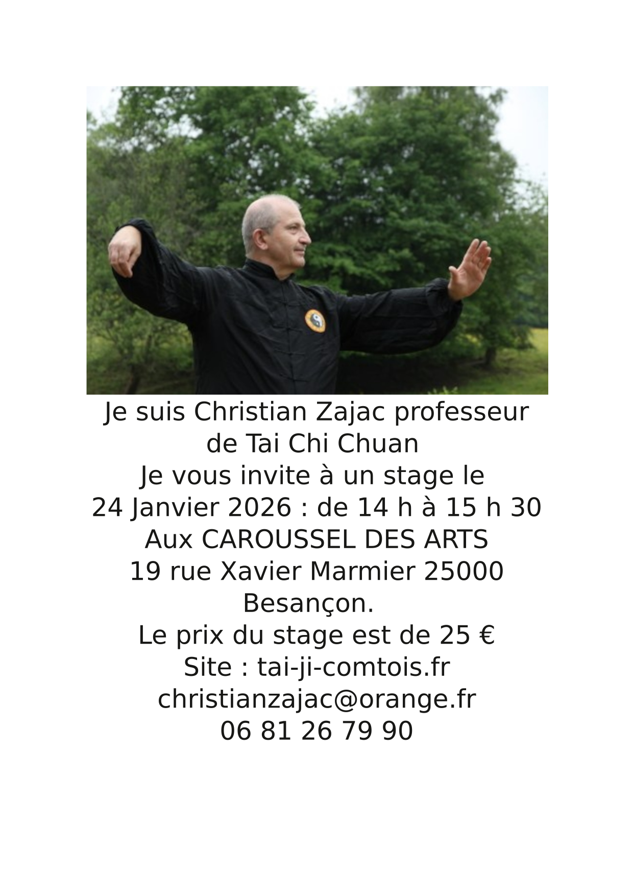 Christian Zajac vous invite à un stage de TAI CHI CHUAN le samedi 6 septembre au Carrousel des Arts, de 15h à 17h.