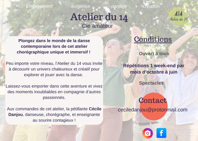 Une expérience artistique riche, vibrante, collective… et peut-être même un peu épique ! Alors, plus d’hésitations : rejoignez l’Atelier du 14 et entrez dans la danse !