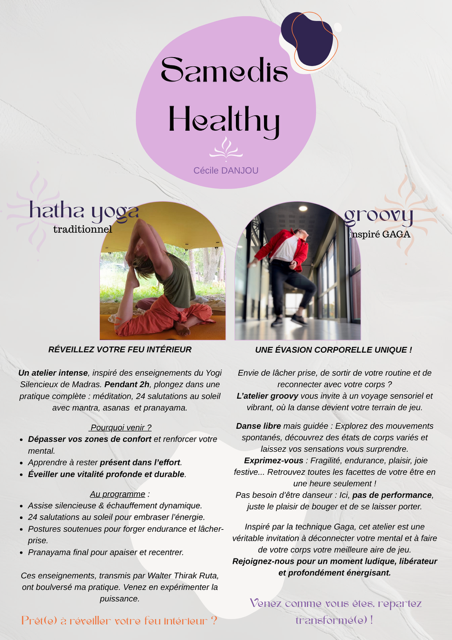Les Samedi Healthy c’est doux, c’est fun, c'est physique, c’est vibrant et ouvert à toutes et tous. Et surtout, c’est pour toi, si tu veux t’offrir un moment rien qu’à toi. Alors, prêt·e à te faire du bien ?