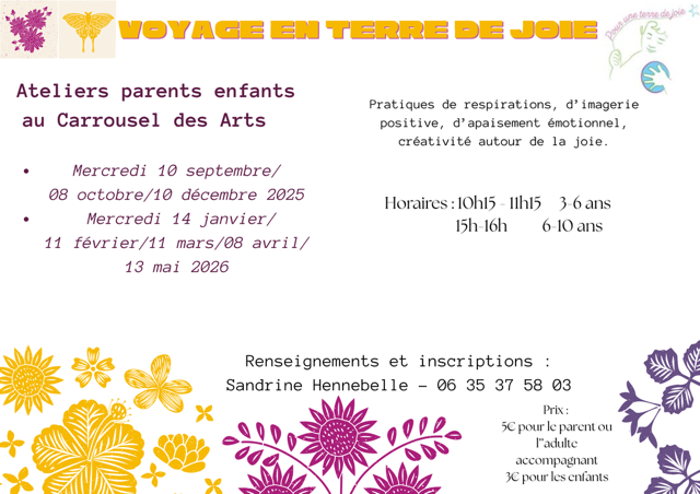 Terre de joie est au départ un dispositif créé pour l’intervention en classe de maternelle et élémentaire. Il s’appuie sur des activités rituelles et créatives basées sur la joie et l’altruisme destinées à apaiser et trouver des ressources en soi. Les quatre concepts clés sont la joie, l’empathie, la créativité, l’imaginaire et le héros. Je propose donc de vivre cela en famille (parents/enfants ou grands-parents/petits-enfants) afin de partager et d’unir les liens par des exercices qui nous relient. Même si je n’aime pas le terme exercices auquel je préfère celui d’expériences. Expérimenter, vivre l’instant présent se connecter à soi et aux autres c’est ma part du Colibri à une société en mutation.